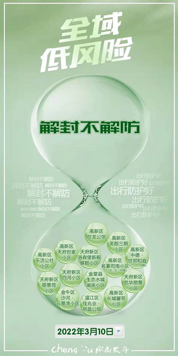 3月10日0时,成都此轮本土疫情最后三个中风险区:高新区名著司南小区7栋、8栋、9栋、10栋,乐活公社小区,英郡三期小区,正式解封。至此,成都全域实现低风险。
